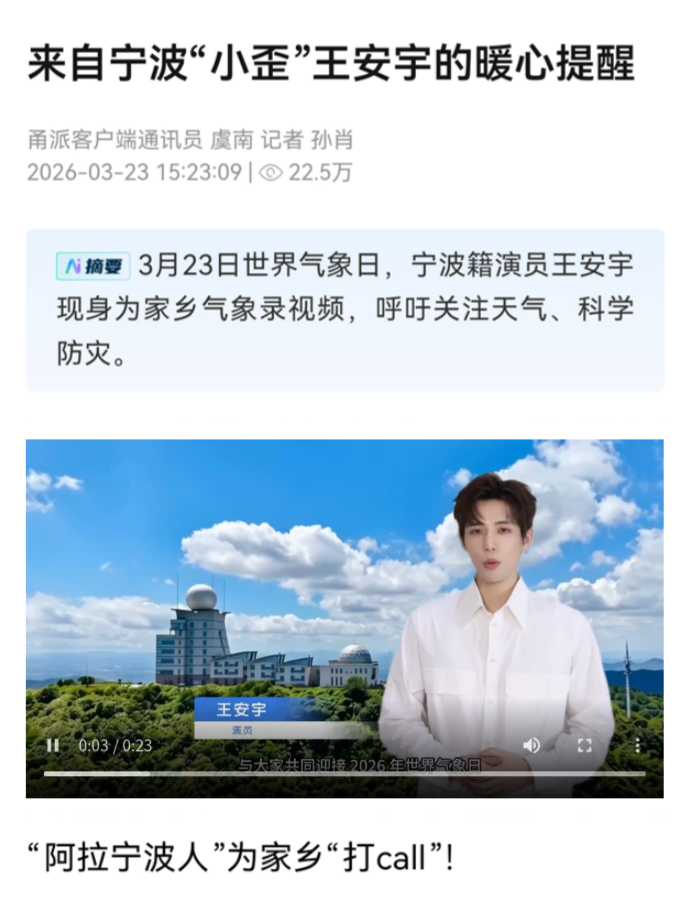 明星打Call,引發(fā)強烈反響。3月23日,青年演員王安宇驚喜亮相,特地為寧波氣象錄制一段視頻,真誠呼吁公眾關(guān)注天氣變化、共同守護家園。該視頻獲中國氣象局、浙江省氣象局及甬派等主流媒體紛紛轉(zhuǎn)發(fā),網(wǎng)友互動留言熱烈回應,引起社會各界強烈反響?!皩幉ㄌ鞖狻惫俜蕉兑籼?2小時觀看量突破10萬。